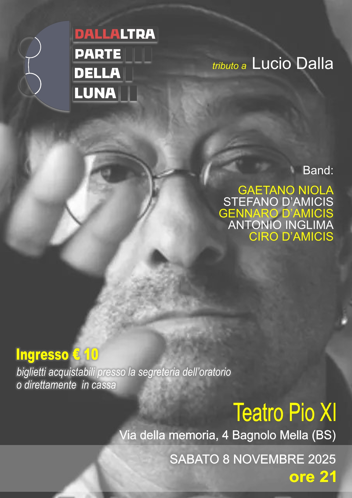 | Trama: Un viaggio emozionante attraverso l’intera produzione artistica di Lucio Dalla, un omaggio che abbraccia sia i suoi grandi successi che le canzoni meno conosciute, ma altrettanto affascinanti. Gli arrangiamenti musicali sono stati curati con grande attenzione: alcuni sono fedeli alle versioni originali, mentre altri sono stati reinterpretati con arrangiamenti inediti che donano una nuova luce alle melodie amate da tutti. Inoltre, lo spettacolo include momenti di racconto, con aneddoti e audio che permettono al pubblico di immergersi ancora di più nel mondo di Lucio Dalla, scoprendo curiosità e le storie dietro le sue canzoni. |