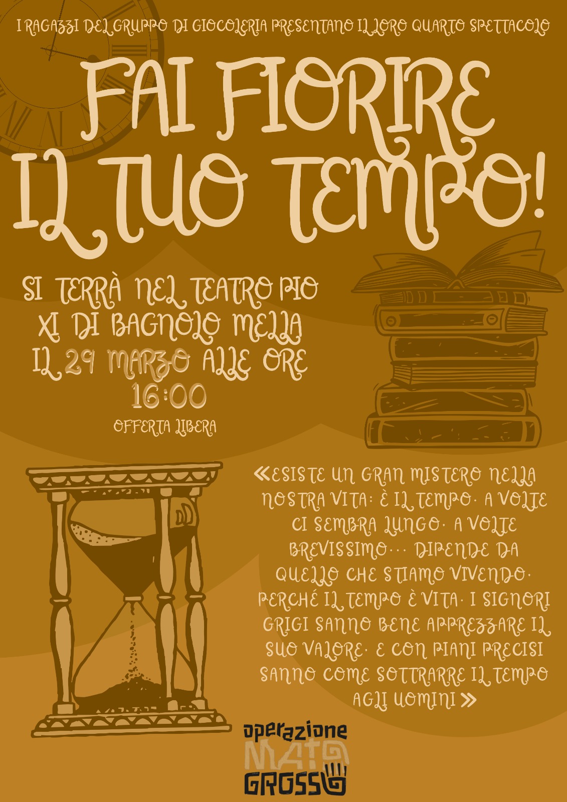 | Trama: I ragazzi del gruppo di Giocoleria presentano il loro spettacolo annuale. Esiste un gran mistero nella nostra vita: è il tempo. A volte ci sembra lungo, a volte brevissimo... dipende da quello che stiamo vivendo. Perché il tempo è vita. I signori grigi sanno bene apprezzare il suo valore. E con piani precisi sanno come sottrarre il tempo agli uomini. Tutto il ricavato sarà destinato all'operazione Mato Grosso. |
